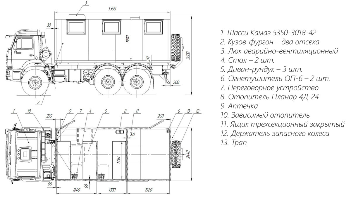 | Ящик в грузовом отсеке у стенки перегородки трехсекционный, закрытый, с крышкой сверху; высота – 1000 мм, ширина – 2330 мм, глубина – 600 мм |